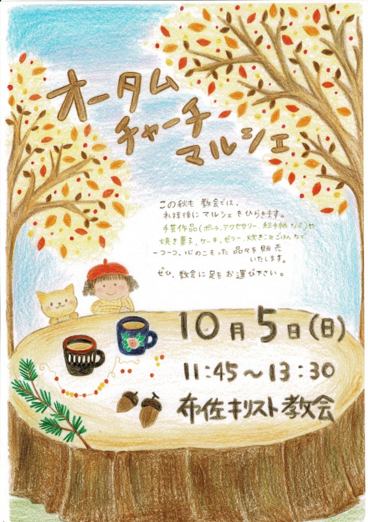 オータムチャーチマルシェ2025 2025年9月7日 最終更新日時 : 2025年9月7日 admin_fusa 布佐キリスト教会で昨年好評だった「オータムチャーチマルシェ」を今年も行います。皆様のお越しをお待ちしています。